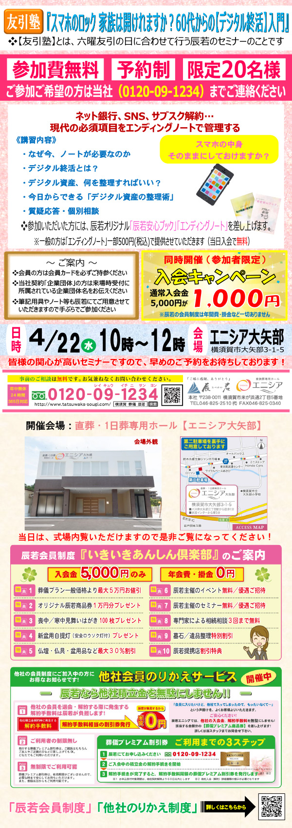 ご葬儀後、多くの方がお困りになるのが「供花のお礼の仕方は?」「供養の相談をできる人がいない」「遺品整理をどうすれば…」といった多岐にわたる内容です。「ご家族が新しい生活を始めるのを見届けるまでが葬儀サービス」 辰若・エニシアでは相談無料で葬儀後のアフターサポートを承っております。
