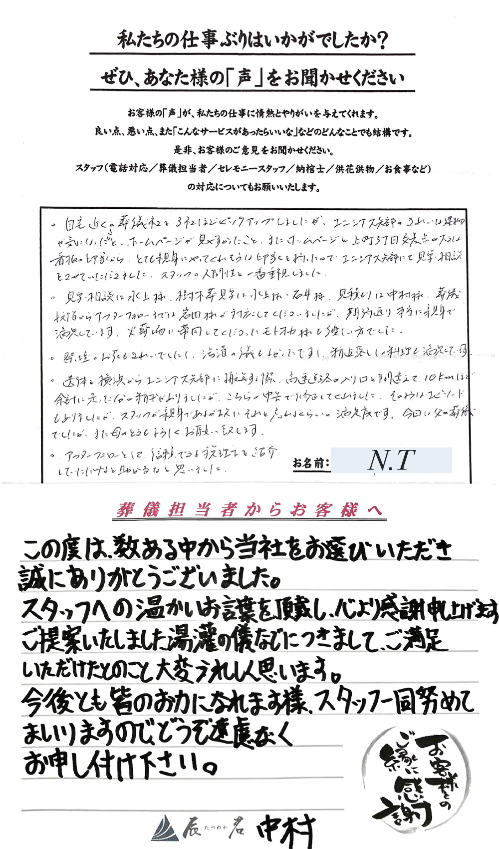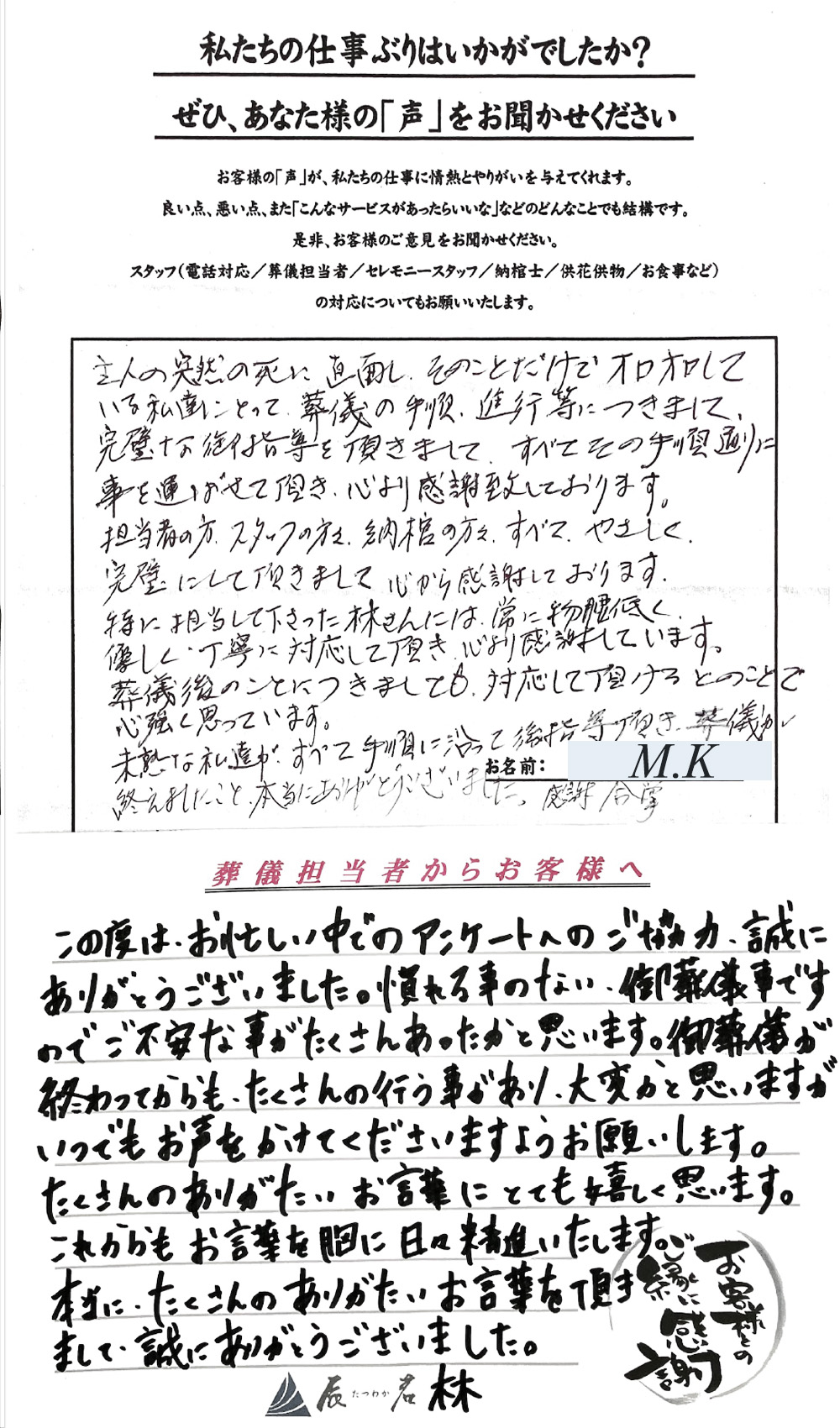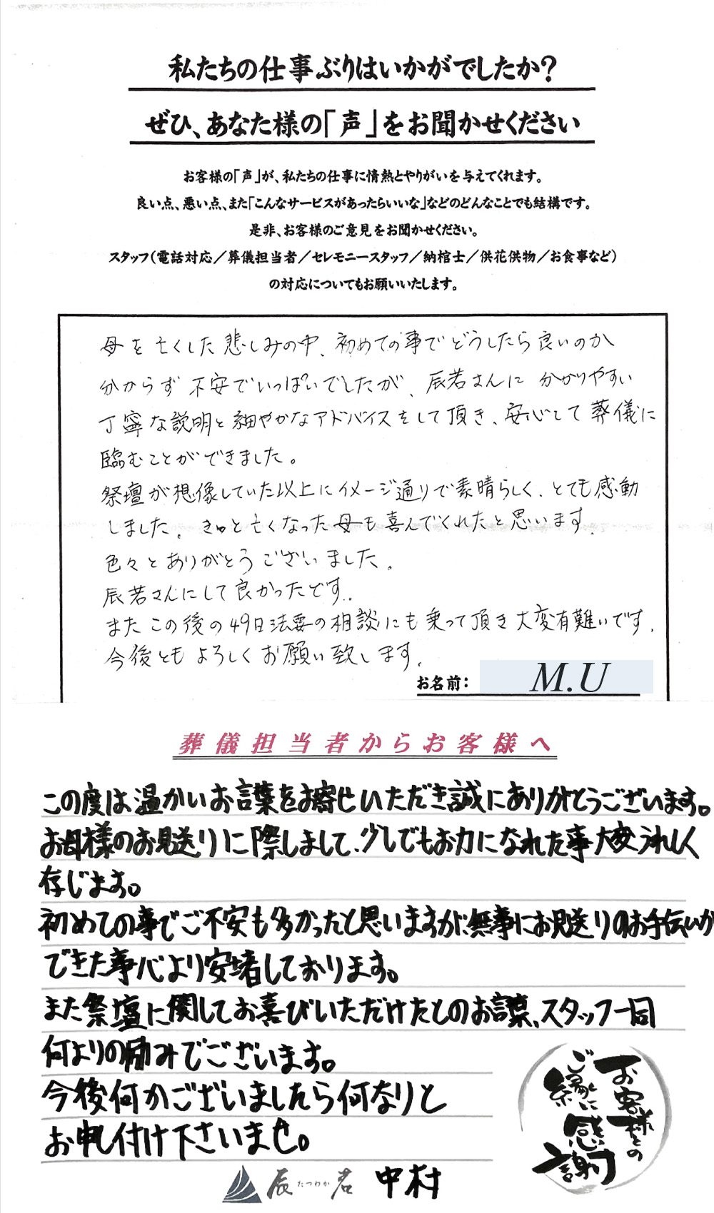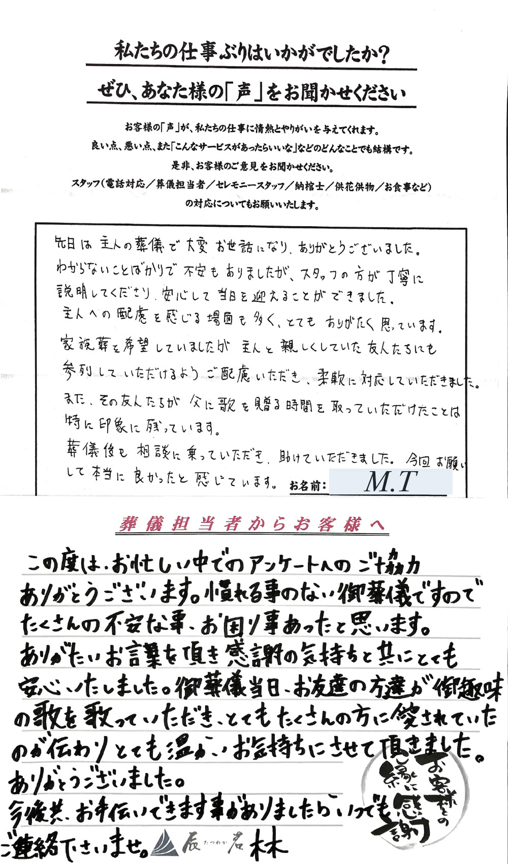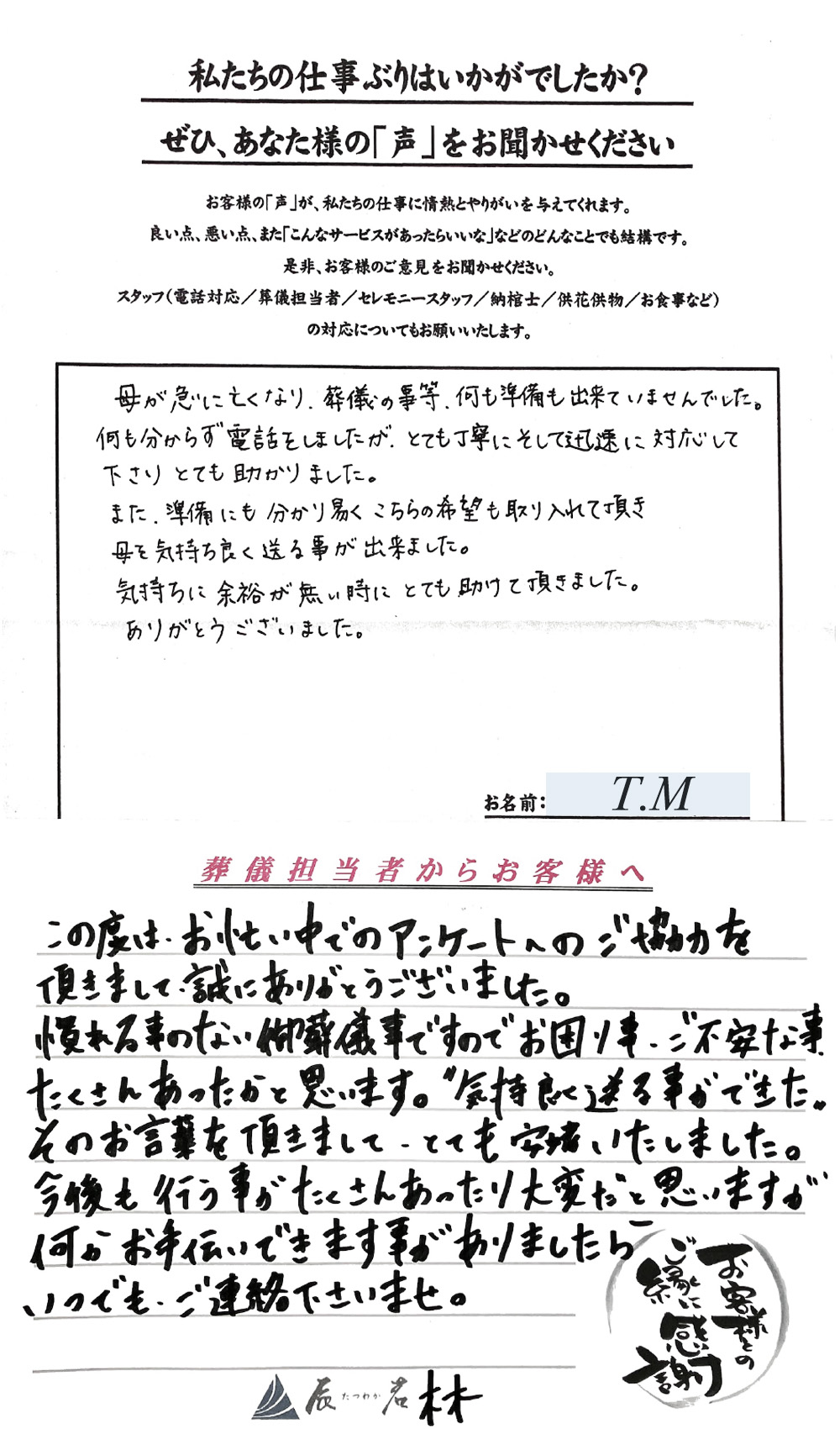 すべて、やさしく完璧にして頂きまして、心から感謝しております。 2025年11月05日 一日葬 主人の突然の死に直面し、そのことだけでオロオロしている私達にとって、葬儀の手順、進行等につきまして、 完璧な指導を頂きまして、すべてその手順通りに 事を運ばせて頂き、心より感謝致しております。 担当…… 詳細を見る