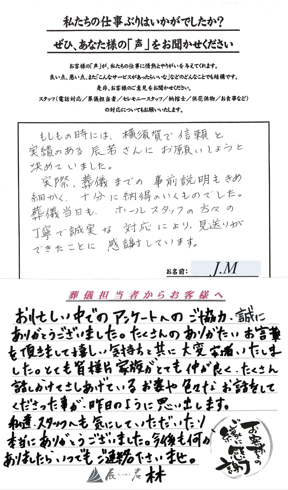 葬儀までの事前説明もきめ細かく、十分に納得のいくものでした。 2025年11月05日 一日葬 もしもの時には、横須賀で信頼と実績のある辰若さんにお願いしようと決めていました。 実際、葬儀までの事前説明もきめ細かく、十分に納得のいくものでした。 葬儀当日も、 ホールスタッフの方々の丁寧で誠実な…… 詳細を見る