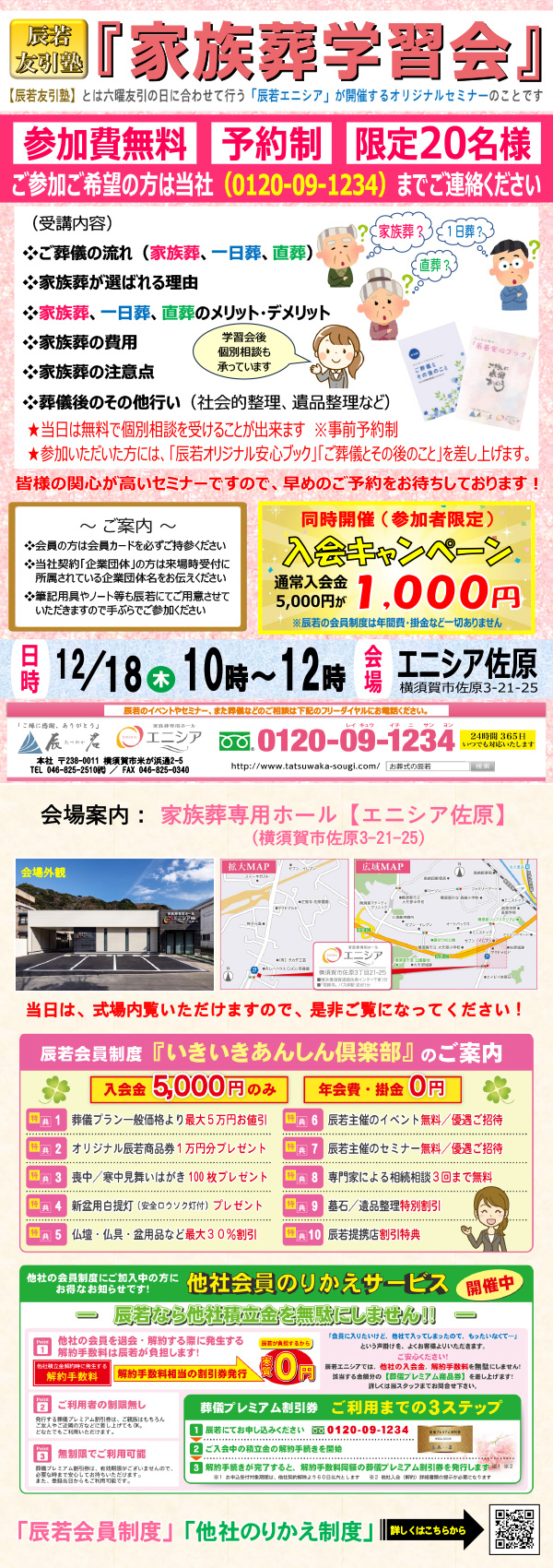 12月18日(木)今年最後の葬儀学習会を横須賀市佐原「家族葬専用ホール」エニシア佐原にて開催いたします。近年増加している「家族葬」に焦点を当て、その流れ、費用、そして準備しておくべきことについて、専……