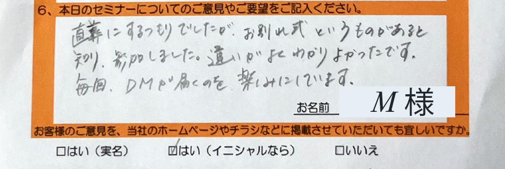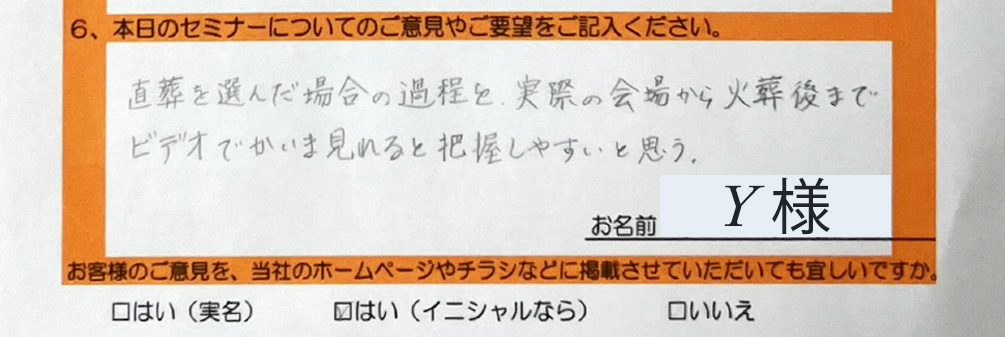 直葬にするつもりでしたが、お別れ式というものがあると知り、参加しました。違いがよくわかりよかったです。毎回、DMが届くのを楽しみにしています。【9月22日(月)海洋散骨学習会】