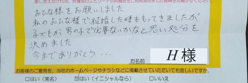 おひな様をお願いしました。私のおひな様で結婚した時に持ってきましたが、子どもが男の子で必要ないかなと思い処分を決めました。今までありがとう…