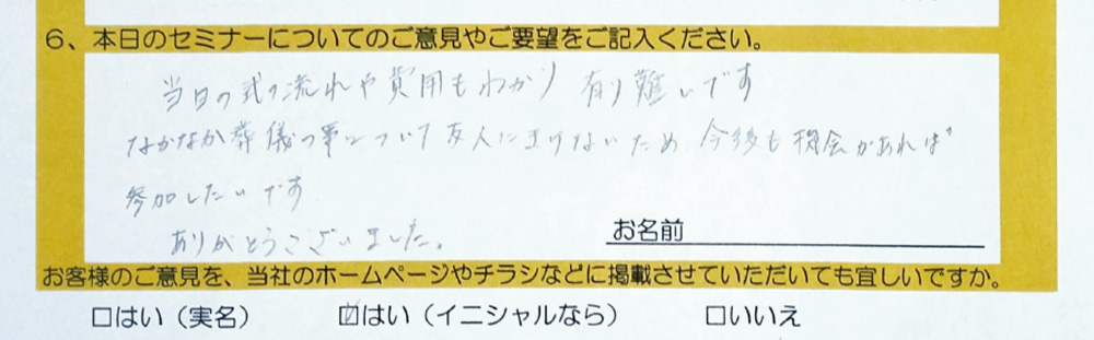 当日の式の流れや費用もわかり有り難いです。なかなか葬儀の事について友人にまけないため、今後も機会があれば参加したいです。ありがとうございました。