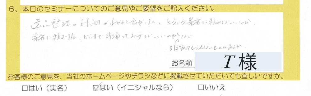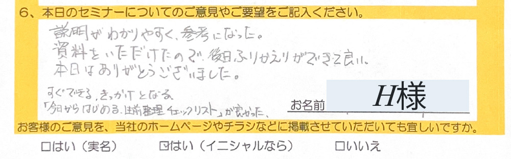 説明がわかりやすく、参考になった。資料をいただけたので後日ふりかえりができて良い。本日はありがとうございました。すぐできるきっかけとなる「今日からはじめる生前整理チェックリスト」が良かった。