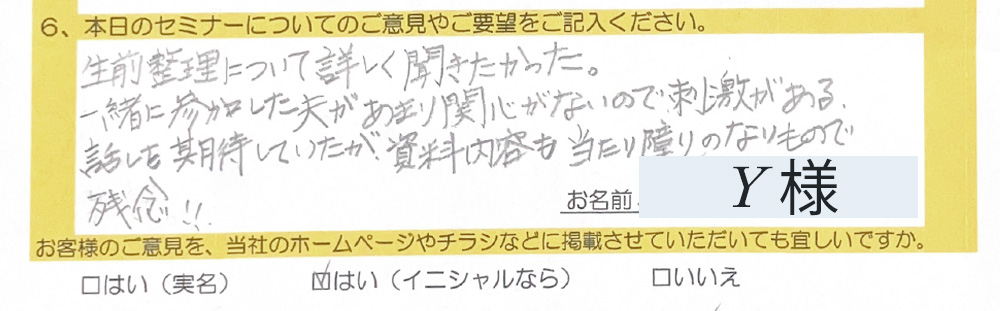 生前整理について詳しく聞きたかった。 一緒に参加した夫があまり関心がないので刺激がある話しを期待していたが、資料内容も当たり障りのないもので残念!!