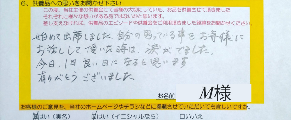 始めて出席しました。自分の思っている事をお寺様にお話しして頂いた時は、涙がでました。 今日、1日良い日になると思います。有りがとうございました。