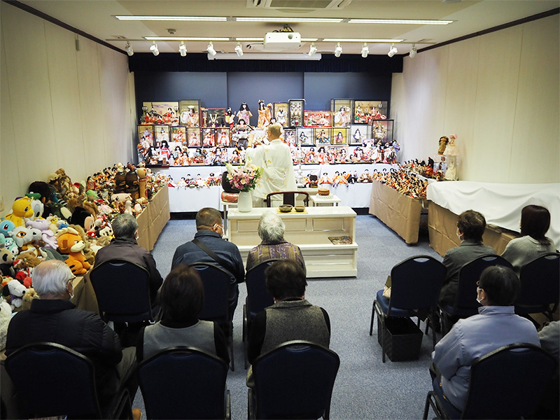 大切にされていたお人形やぬいぐるみに感謝を込めてお別れをする「人形供養会」を執り行いました。当日は、祭壇いっぱいに並んだ思い出の品々を前に、寺院様による読経のもと、皆様と共にお焼香を捧げました。
