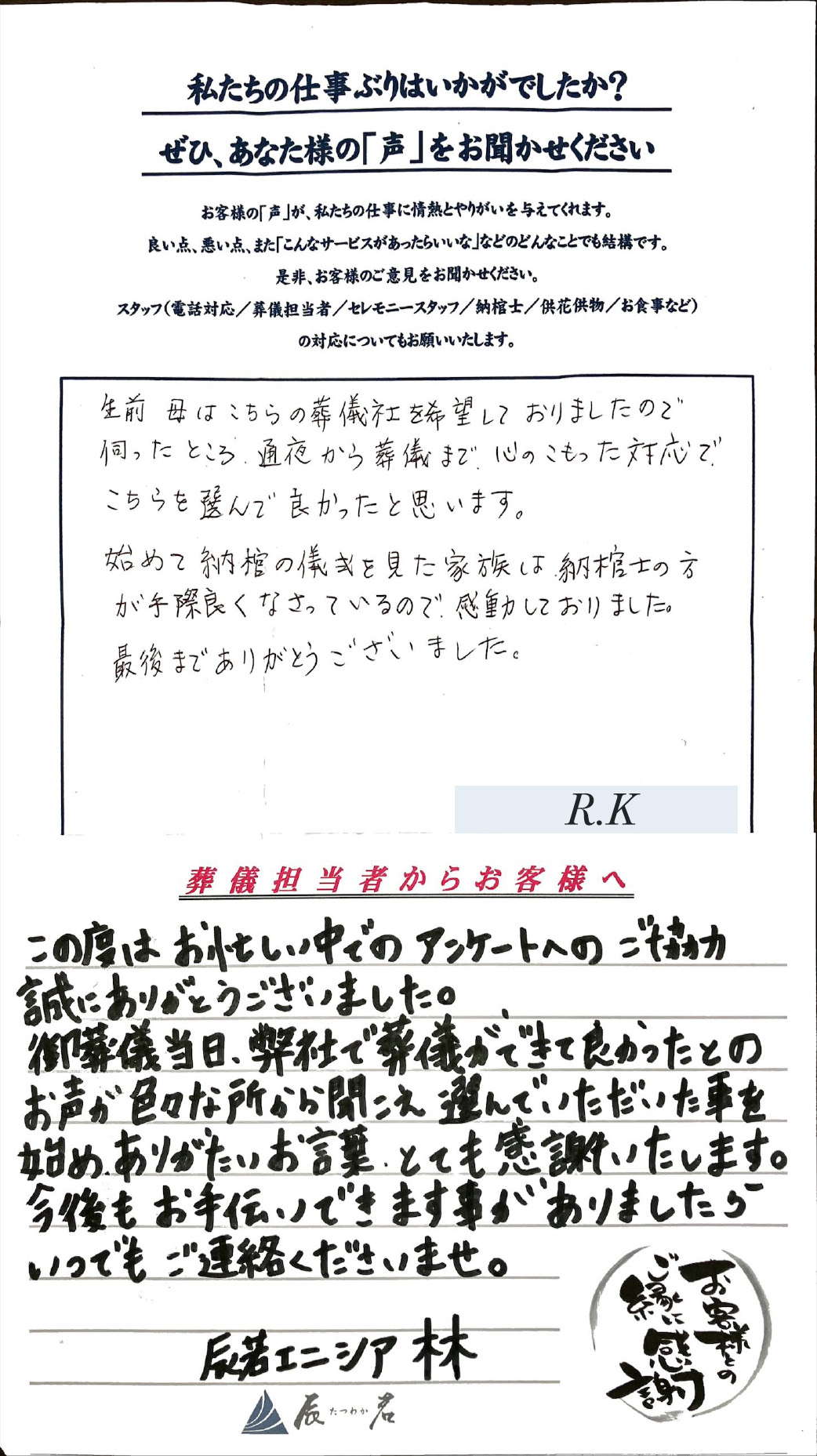 始めて納棺の儀式を見た家族は、納棺士の方が手際良くなさっているので、感動しておりました。 最後までありがとうございました。