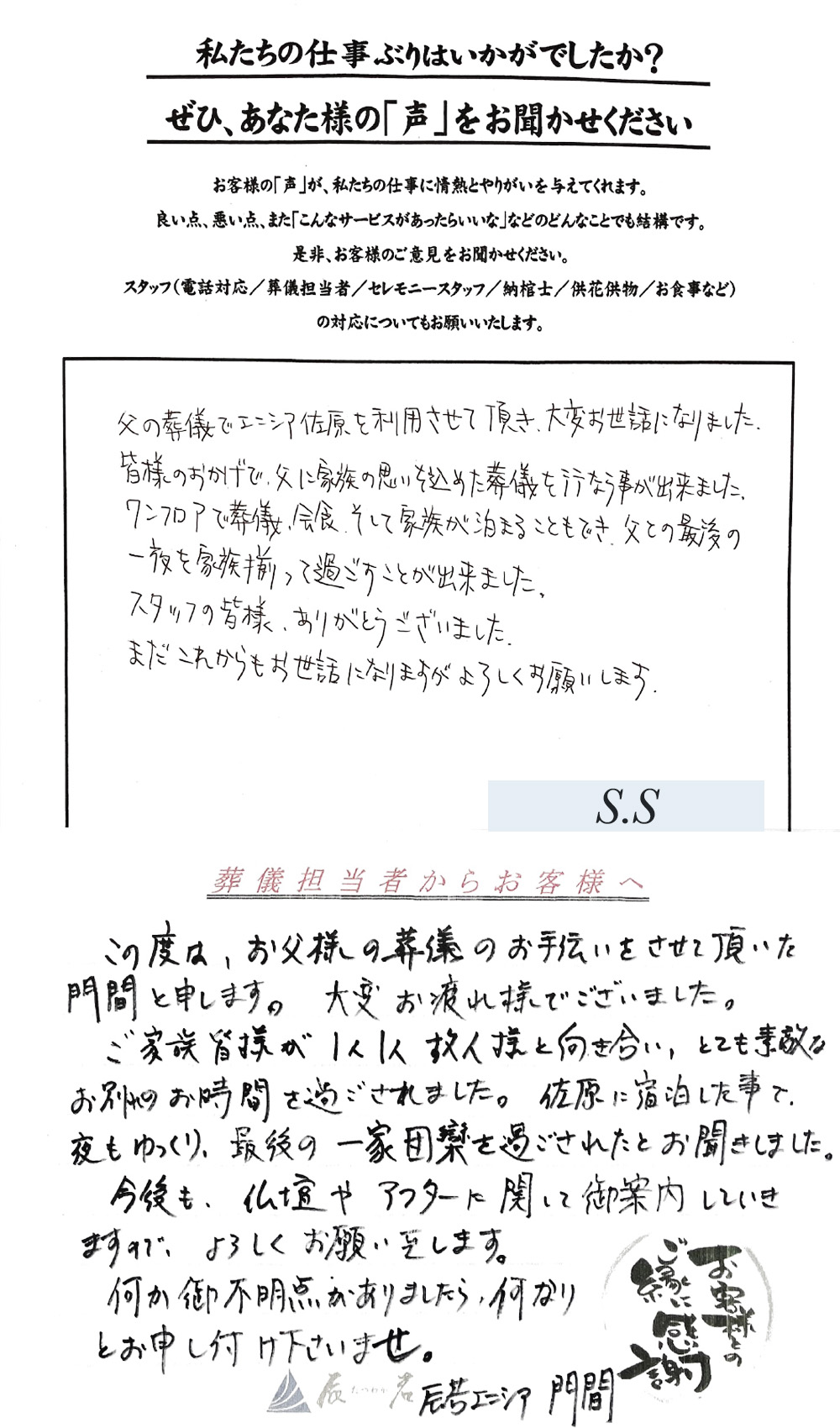 父の葬儀でエニシア佐原を利用させて頂き、大変お世話になりました。 皆様のおかげで、父に家族の思いを込めた葬儀を行なう事が出来ました。ワンフロアで葬儀、会食、そして家族が泊まることもでき、父との最後の 一夜を家族揃って過ごすことが出来ました。