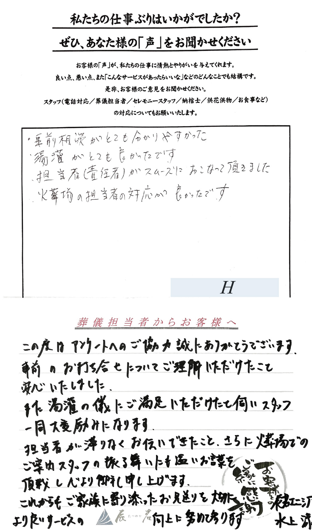 この度はアンケートへのご協力誠にありがとうございます。 事前のお打ち合せについてご理解いただけたこと、安心いたしました。また、湯灌の儀にご満足いただけたと伺いスタッフ一同大変励みになります。担当者が滞りなくお伝いできたこと、さらに、火葬場でのご案内スタッフの振る舞いにも温かいお言葉を頂戴し心より御礼申し上げます。これからもご家族に寄り添ったお見送りを大切により良いサービスの向上に努めて参ります。