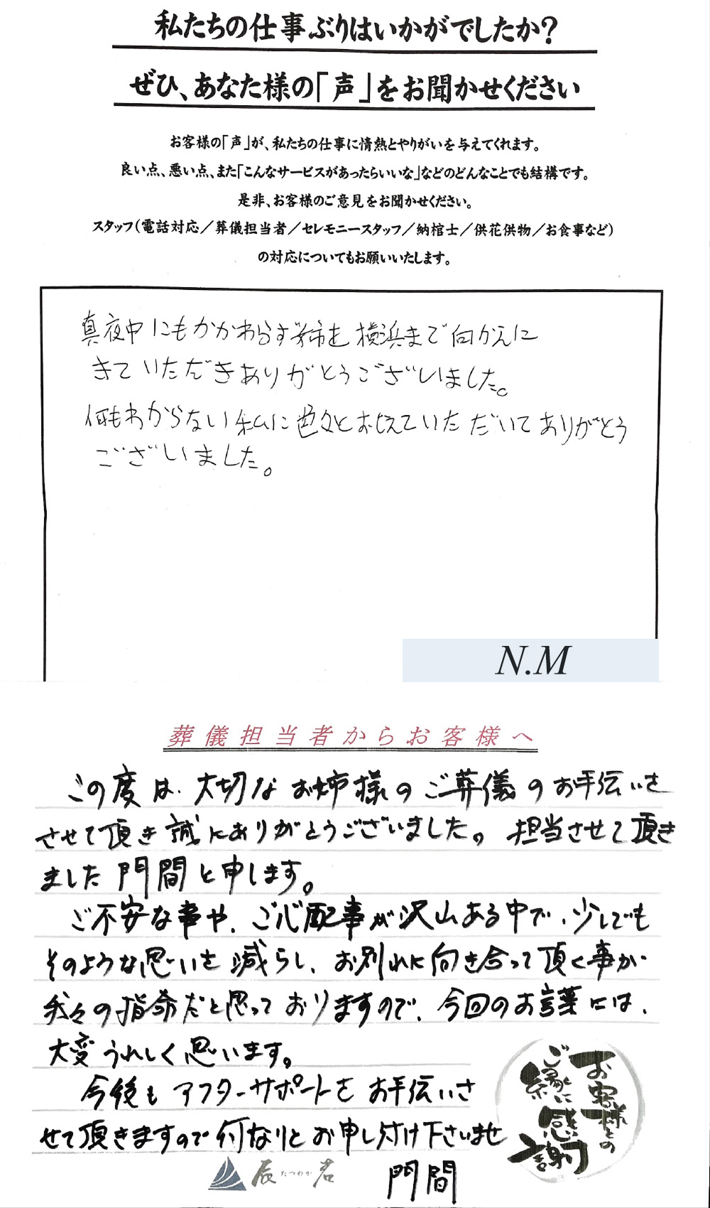 真夜中にもかかわらず姉を横浜まで向かえに きていただきありがとうございました。 何もわからない私に色々とおしえていただいてありがとう ございました。