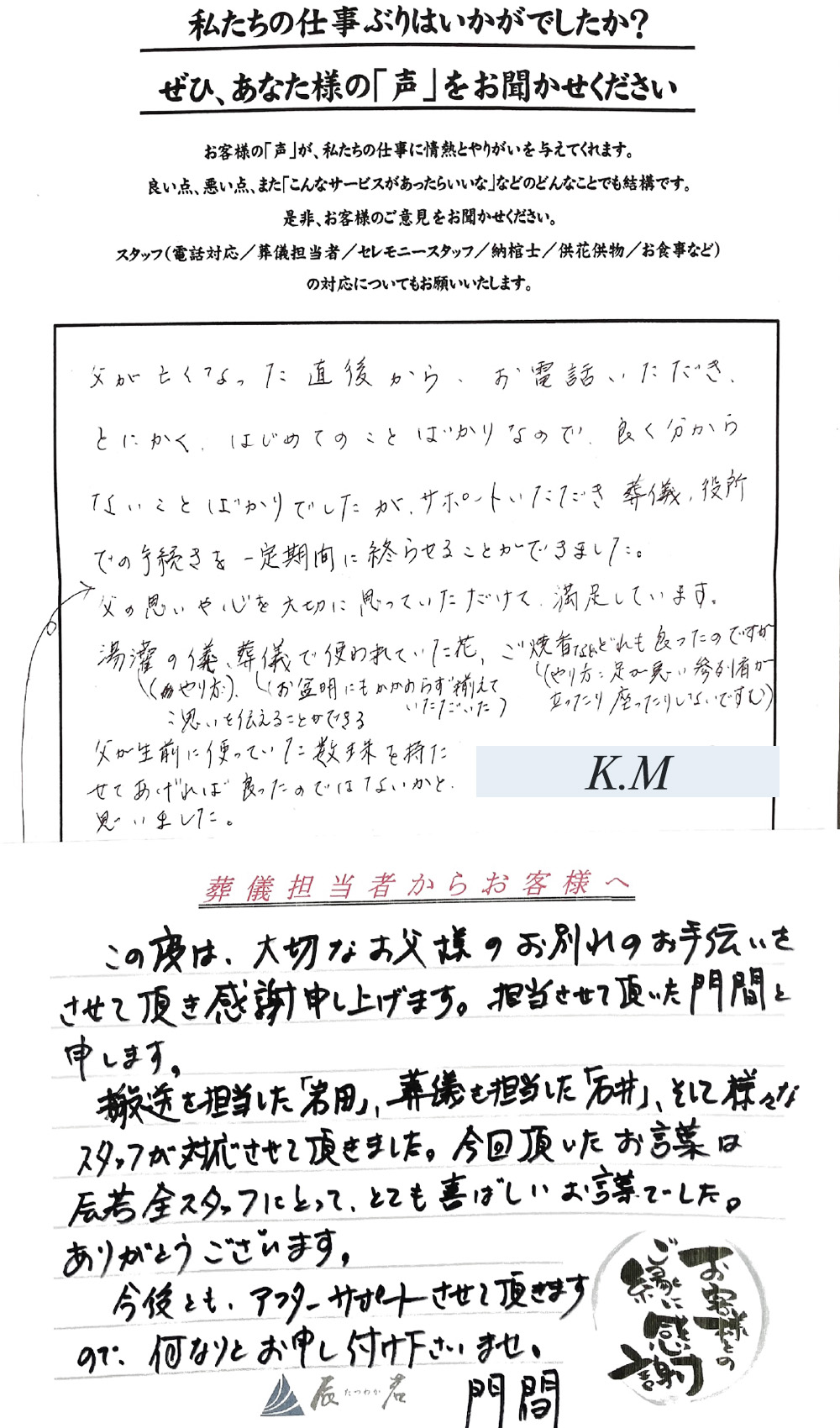 父が亡くなった直後からお電話いただき、とにかく、はじめてのことばかりなので、良く分からないことばかりでしたが、サポートいただき葬儀、役所での手続きを一定期間に終らせることができました。 父の思いや心を大切に思っていただけて、満足しています。湯灌の儀、葬儀で使われていた花、ご焼香などれも良ったのですが、思いを伝えることができる父が生前に使っていた数珠を持たせてあげれば良ったのではないかと、思いました。