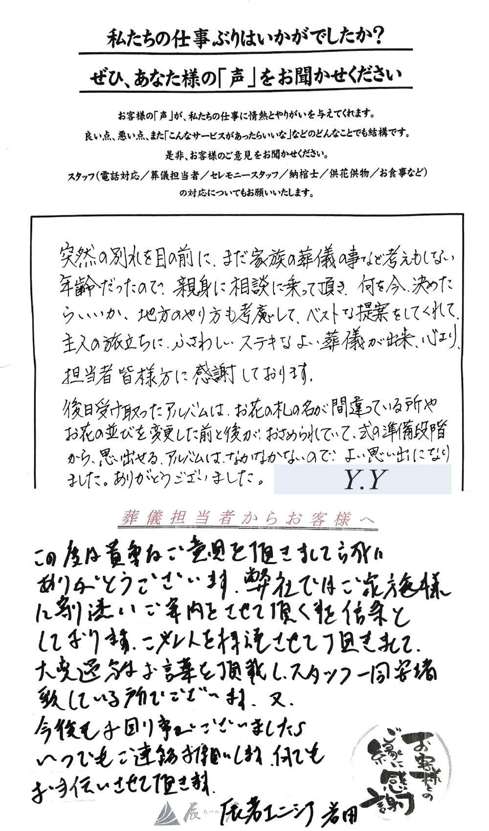 突然の別れを目の前に、まだ家族の葬儀の事など考えもしない年齢だったので、親身に相談に乗って頂き、何を今、決めた らいいか、地方のやり方も考慮して、ベストな提案をしてくれて主人の旅立ちにふさわしいステキなよい葬儀が出来、心より、 担当者皆様方に感謝しております。後日受け取ったアルバムは、お花の札の名が間違っている所や、お花の並びを変更した前と後が、おさめられていて、式の準備段階 から、思い出せる、アルバムはなかなかないので、よい思い出になりました。ありがとうございました。