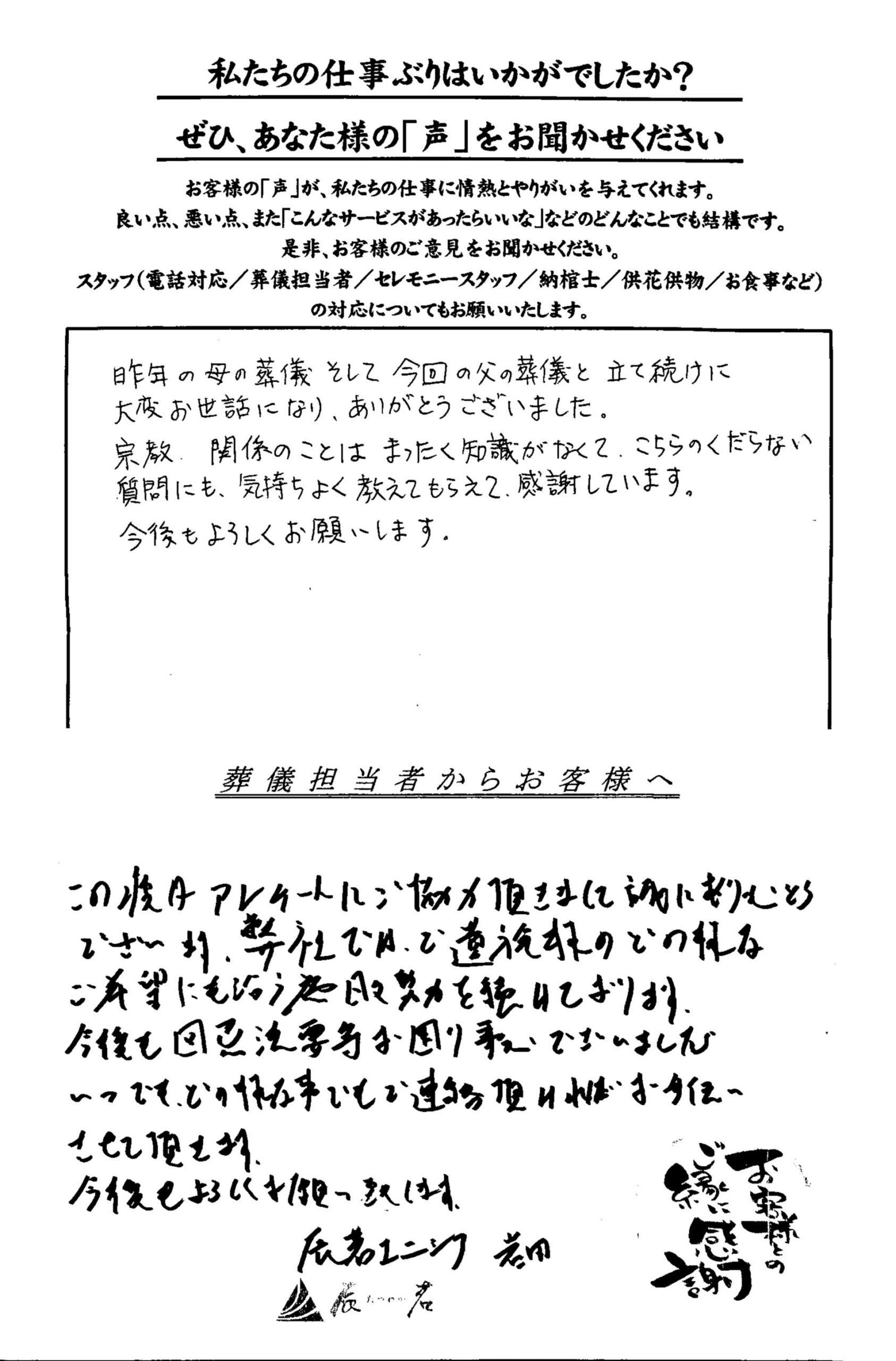 昨年母の葬儀、そして今回の父の葬儀と立て続けに大変お世話になり、ありがとうございました。宗教、関係のことはまったく知識がなくて、こちらのくだらない質問にも、気持ちよく教えてもらえて、感謝しています。今後もよろしくお願いします。